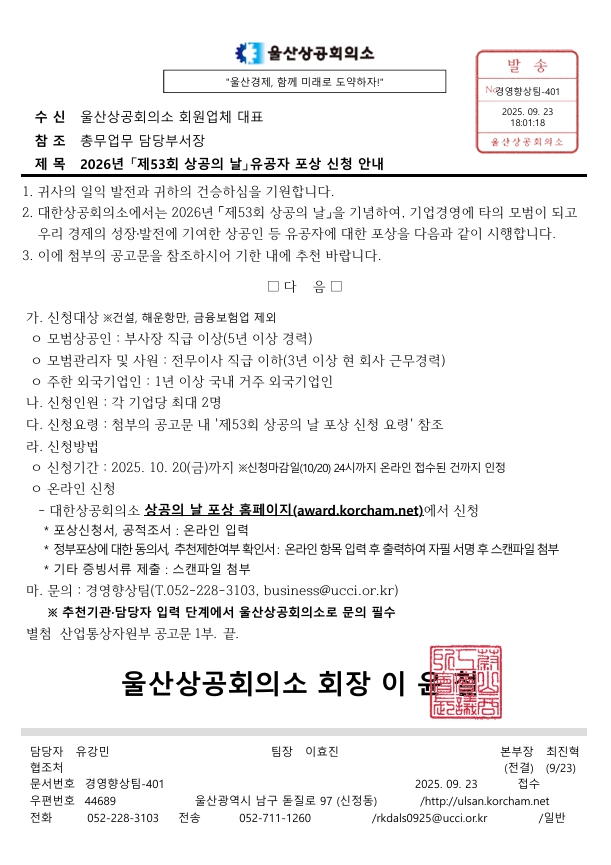 ‒ | 2026년 「제53회 상공의 날」 유공자 포상 신청 안내 |