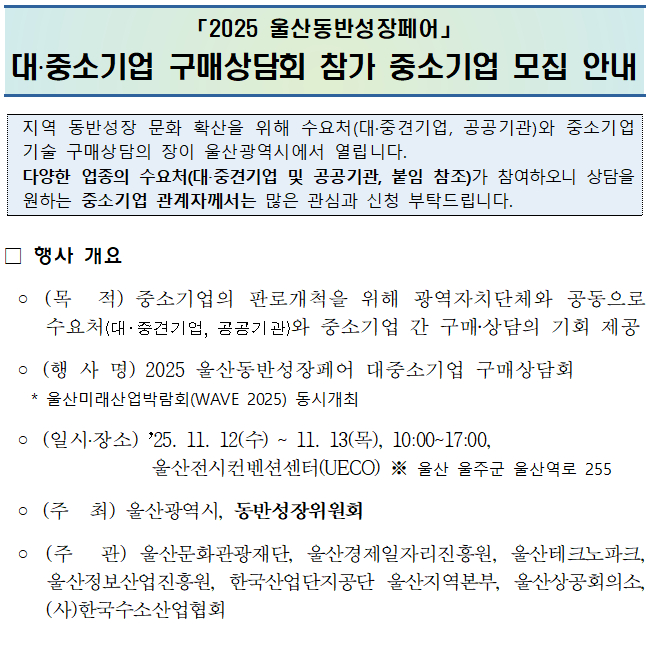 | 제목 | [울산광역시] 대중소기업 상생협력 구매상담회 참가 중소기업 모집 안내 | |||||||||||||||||||||||||||