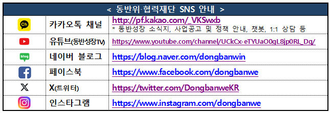 ※ 동반성장위원회 SNS를 통해 대‧중견기업, 공공기관의 동반성장 활동과 다양한 중소기업 지원사업, 행사 안내를 드리고 있으니 적극적인 참여 부탁드립니다.