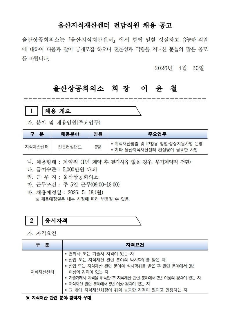 | ‒ | 울산지식재산센터 전문컨설턴트 채용 공고(~5/4) |