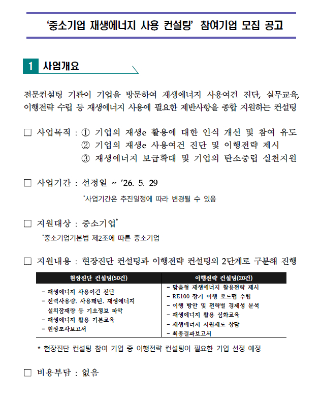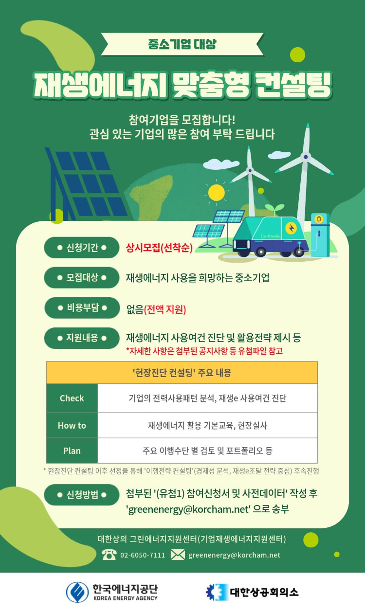 | ‒ | [대한상공회의소] '중소기업 재생에너지 맞춤형 컨설팅' 모집 |