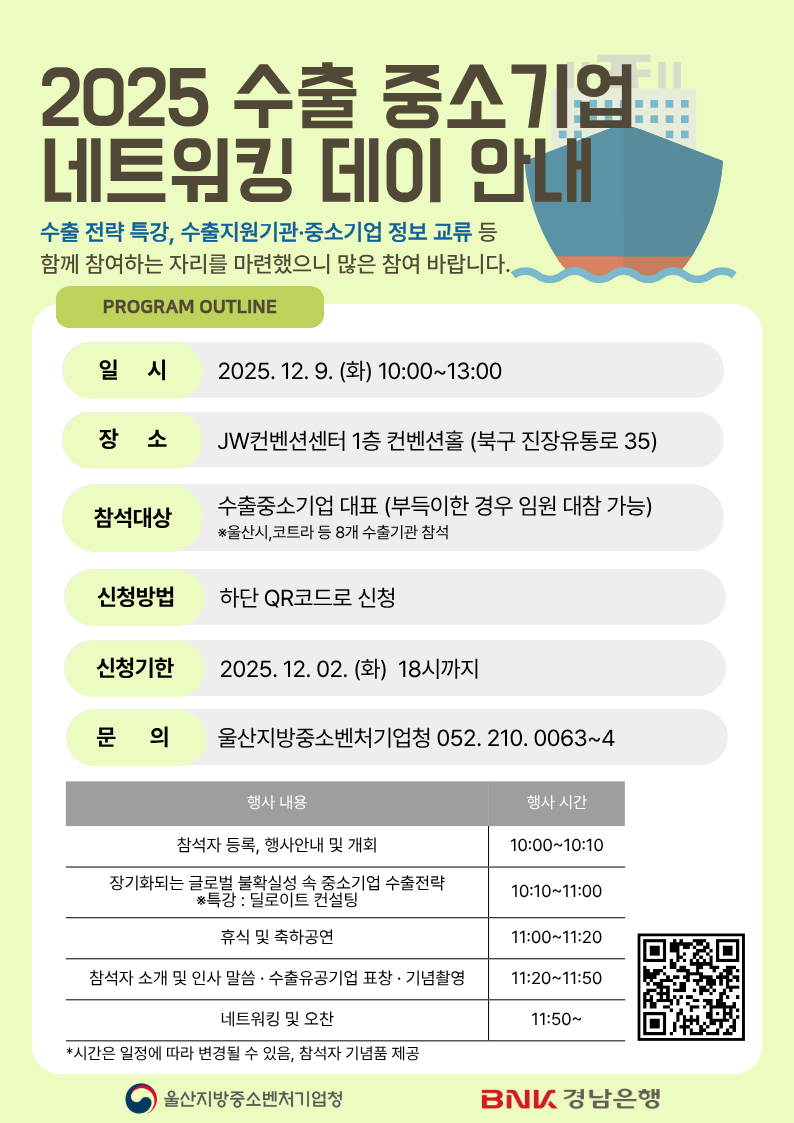 | ‒ | [울산지방중소벤처기업청] 2025 수출 중소기업 네트워킹 데이 개최 안내 |