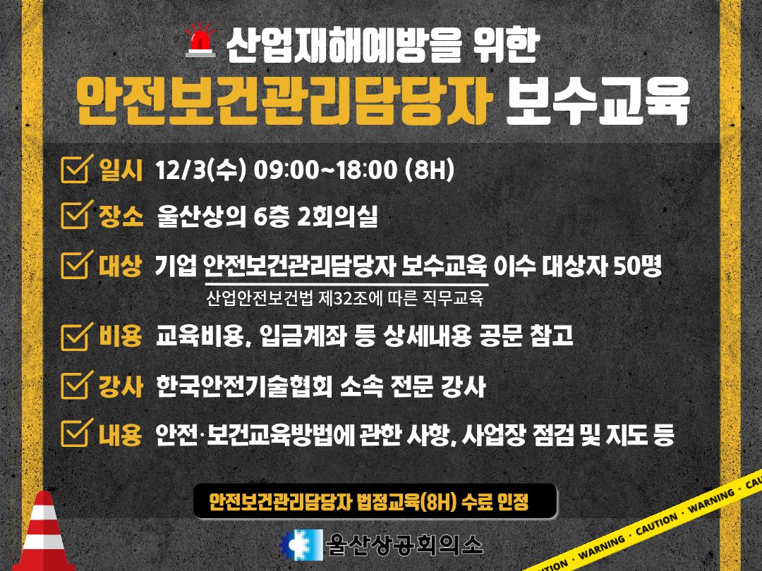 | 제목 | 산업재해예방을 위한 안전보건관리담당자 보수교육 | ||